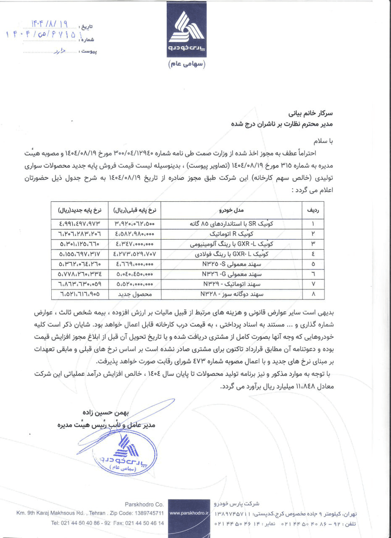شرکت پارس خودرو قیمت محصولاتش را گران کرد.