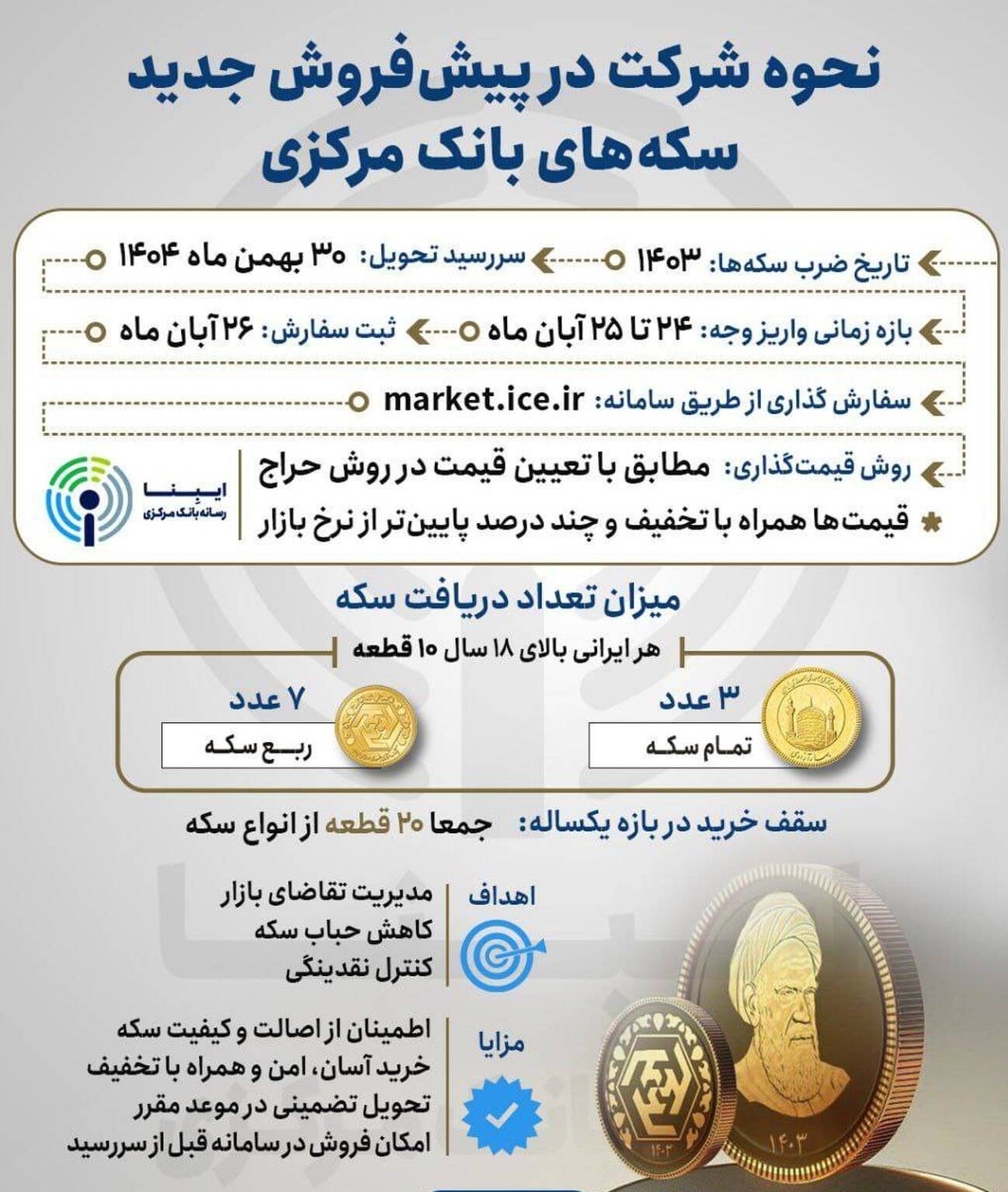 پیشفروش جدید براساس دستورالعمل بانک مرکزی و با سررسید 30 بهمنماه 1404 انجام میشود. این بار نیز روش قیمتگذاری بهصورت حراج ثبت سفارش و تخصیص بر مبنای اولویت قیمت–زمان خواهد بود؛ مشابه پنج مرحله گذشته، با هدف کنترل تقاضا و شفافسازی روند عرضه ریالی مسکوکات.
