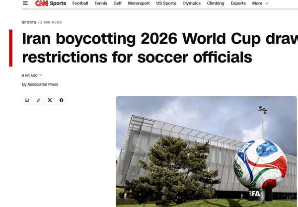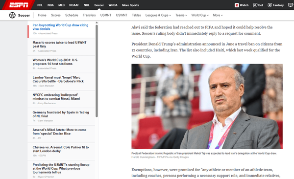حالا سایت ESPN می‌نویسد که ایران مراسم قرعه کشی جام جهانی را بایکوت کرده چون دولت آمریکا به رئیس فدراسیون فوتبال این کشور به عنوان رهبر هیئت اعزامی ایران ویزا نداده و این اقدام را سیاسی می‌داند.