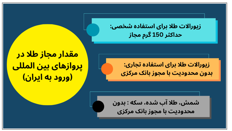 اگر مسافر قصد حمل طلا بیش از 150 گرم به داخل ایران رو داشته باشه باید قبل از ورود به فرودگاه های ایران از بانک مرکزی مجوز گرفته باشد