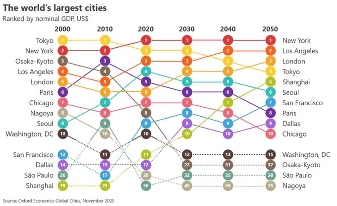 با استناد به پیشبینیهای آکسفورد ایکانومیکز، جهان تا سال ۲۰۵۰ شاهد بازترسیم نقشه اقتصاد شهری خواهد بود. در این آینده نزدیک، آسیا سهم بزرگی از اقتصاد جهانی را بهدست میگیرد و برخی کلانشهرهای آن جایگاه سنتی شهرهای غربی را تصاحب خواهند کرد. این جابهجایی بزرگ اقتصادی آثار چشمگیری بر تجارت جهانی، بازار کار، تحولات فناوری و حتی موازنه سیاسی قدرت در جهان بر جای خواهد گذاشت.