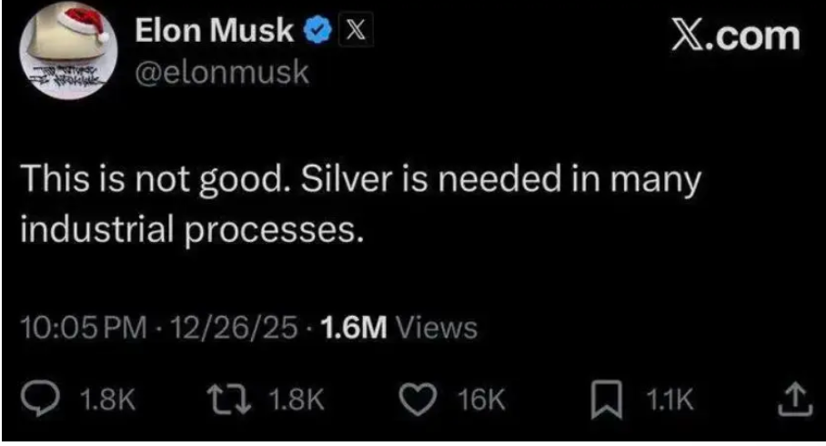 ایلان ماسک در واکنش به افزایش بیسابقه قیمت نقره گفت این روند «خوب نیست»، زیرا نقره در بسیاری از فرآیندهای صنعتی نقشی حیاتی دارد و میتواند تولیدات را با چالش جدی روبهرو کند.