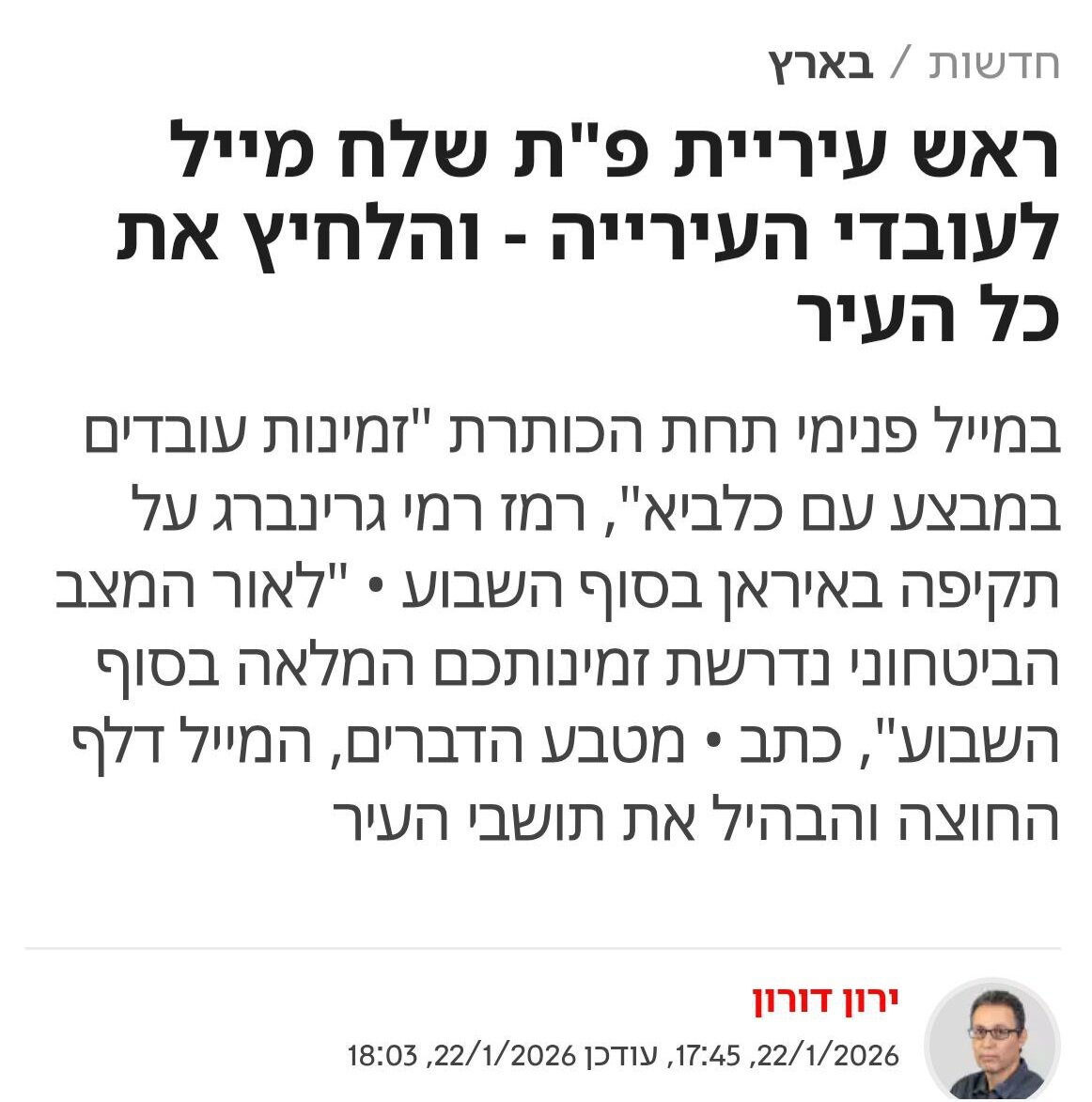 این شهردار صهیونیست، در پیام خود به کارکنان شهرداری می‌افزاید: «پس از دریافت اعلان هشدار و فراخوان باید فوراً به مکانی که تعیین می‌شود مراجعه کنید و مطابق دستورات صادره‌، بهترین خدمات ممکن را به ساکنان شهر ارائه دهید».