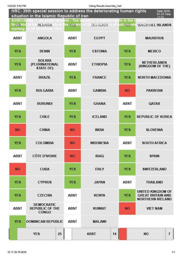 در سی و نهمین جلسه ویژه شورای حقوق بشر سازمان ملل که امروز 3 بهمن 1404 برای رسیدگی به [ادعای] «وضعیت نابسامان حقوق بشر در جمهوری اسلامی ایران» تشکیل شد، پس از شنیدن نظرات موافق و مخالف، قطعنامه پیشنهادی اروپا به رای گذاشته شد که با اکثریت آرا به تصویب رسید.