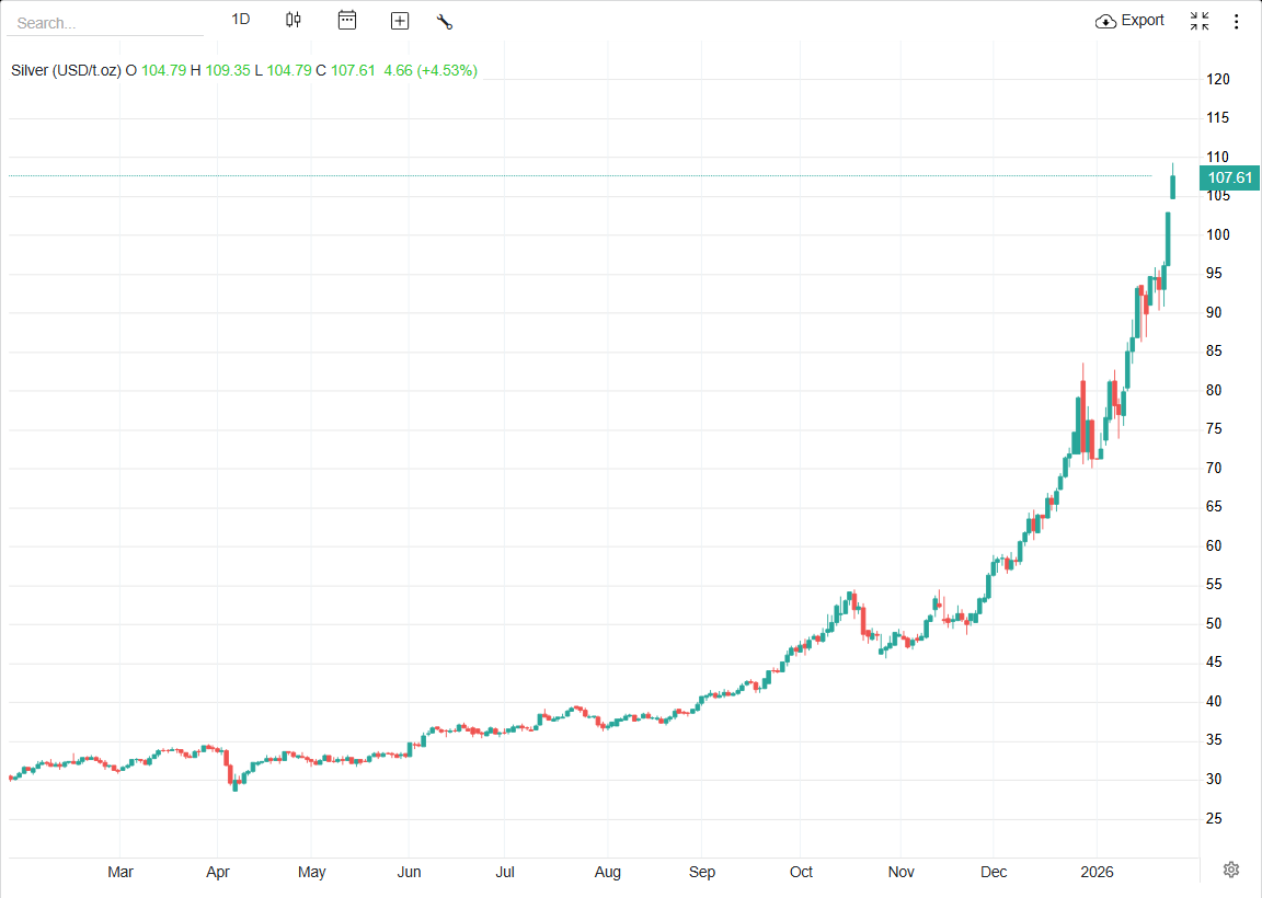 در جریان معاملات آسیایی، قیمت نقره نیز بیش از ۴ درصد جهش کرد و برای اولین بار از مرز ۱۰۹ دلار در هر اونس گذشت. این رشد تاریخی تحت تأثیر سه عامل اصلی تقویت شده است: تقاضای قوی پناهگاه امن و سرمایهگذاری، کمبود مداوم در بازار فیزیکی و عوامل کلان اقتصادی.