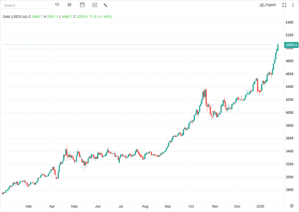 با باز شدن بازارهای آسیایی در بامداد روز دوشنبه ۶ بهمن ۱۴۰۴، قیمت طلا بیش از یک درصد افزایش یافت و برای اولین بار در تاریخ از مرز ۵۰۹۰ دلار در هر اونس گذشت. این صعود بیسابقه در شرایطی ادامه یافته که تقاضای پناهگاه امن به دلیل نااطمینانیهای جهانی در حال تشدید است.