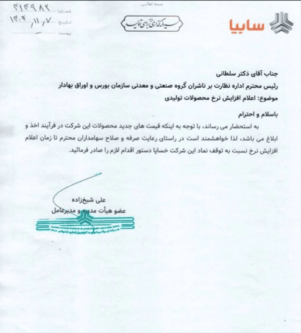 مدیرعامل شرکت سایپا در نامه‌ای رسمی اعلام کرد که بزودی قیمت محصولات این شرکت خودروسازی را افزایش می‌دهد.