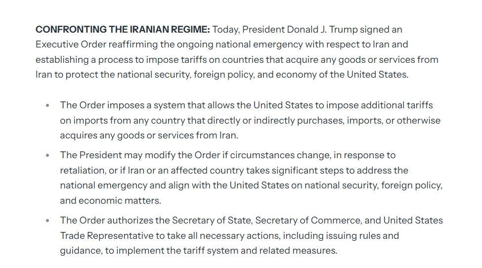 ترامپ در شبکه اجتماعی «تروث سوشال» اعلام کرده بود: از همین حالا، هر کشوری که با جمهوری اسلامی ایران تجارت کند، برای هرگونه تجارت با ایالات متحده آمریکا تعرفه 25 درصدی پرداخت خواهد کرد. این دستور قطعی و نهایی است.