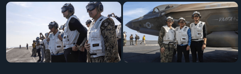 دیروز هم تصاویری از حضور نماینده ویژه دونالد ترامپ استیو ویتکاف و مشاور ترامپ جرد کوشنر به همراه کوپر بر روی عرشه ناو آبراهام لینکن منتشر شد.