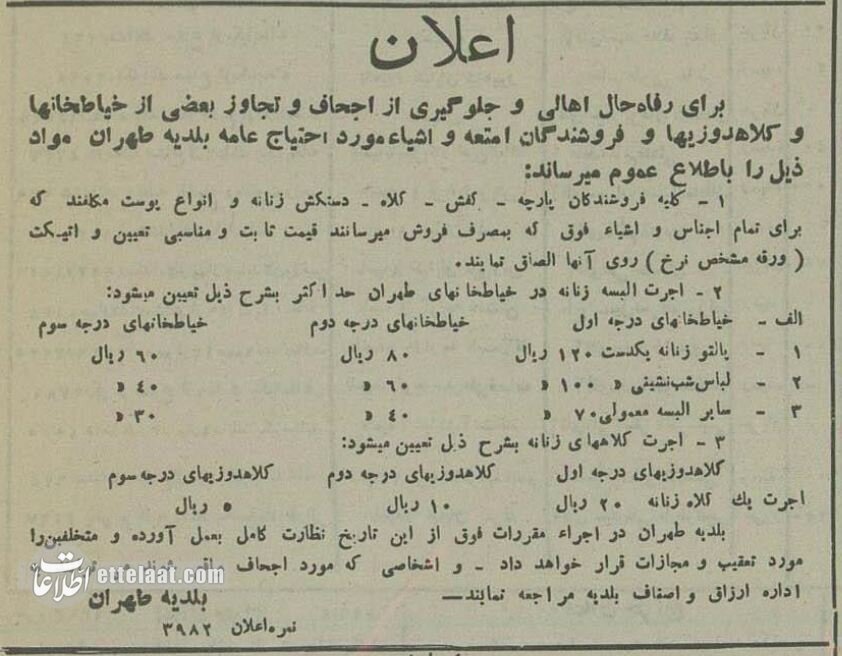 با آغاز اجرای قانون کشف حجاب در ۱۷ دی ۱۳۱۴ و تاکید براستفاده کلاه توسط زنان، کمبود کلاه زنانه در تهران باعث گرانفروشی و کمبود کلاه زنانه شده بود. روزنامه اطلاعات ۲۱ دی ۱۳۱۴ آگهی شهرداری تهران را منتشر کرده که قیمت دوخت انواع کلاه زنانه را به شکل رسمی منتشر کرده. این آگهی تاریخی را بخوانید و آگهیهای فروش کلاه در تهران را دنبال کنید.