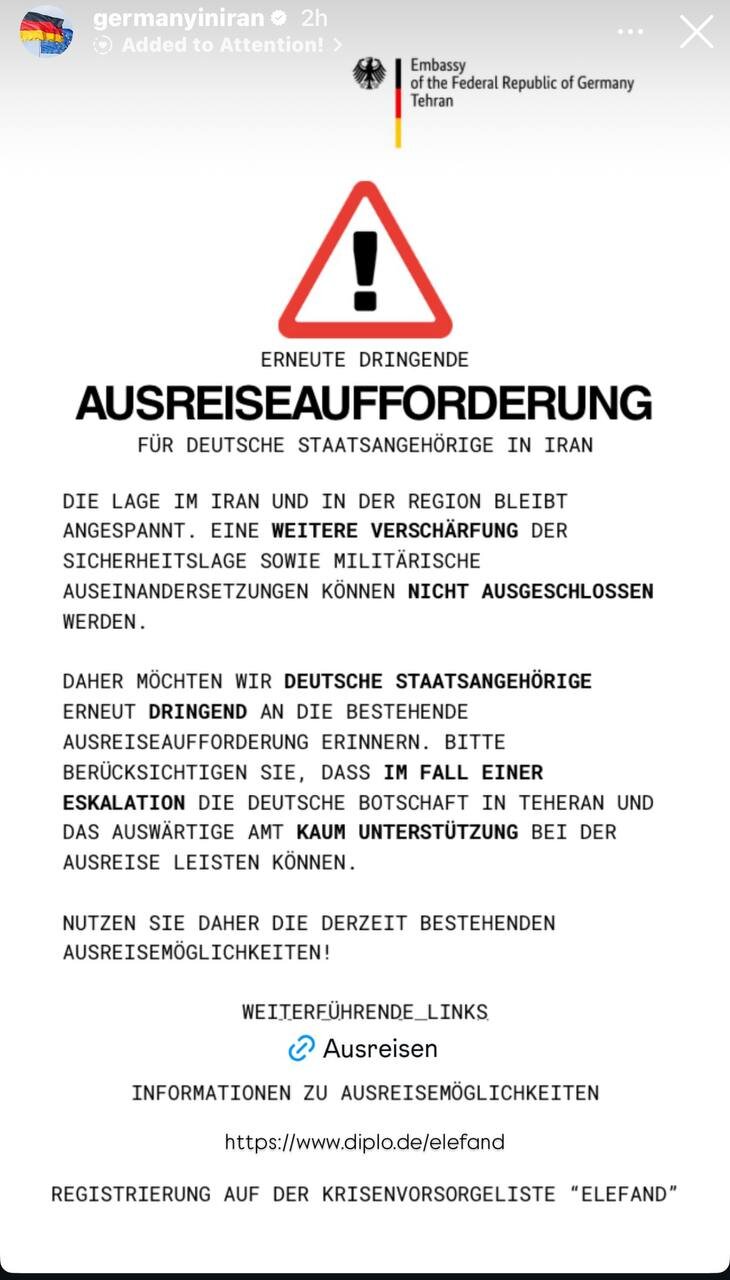 سفارت آلمان از طرف وزارت امورخارجه آلمان نوشته است: وضعیت در ایران و منطقه همچنان متشنج است. تشدید بیشتر وضعیت امنیتی و همچنین درگیری‌های نظامی قابل رد نیست. بنابراین از شهروندان آلمانی مجدداً بطور فوری می‌خواهیم به توصیه قبلی مبنی بر خروج از کشور توجه کنند. لطفاً در نظر داشته باشید که در صورت بروز تنش یا تشدید اوضاع، سفارت آلمان در تهران و وزارت امور خارجه آلمان تقریباً امکان ارائه کمک برای خروج از کشور را نخواهند داشت. از فرصت‌های موجود فعلی برای خروج استفاده کنید.