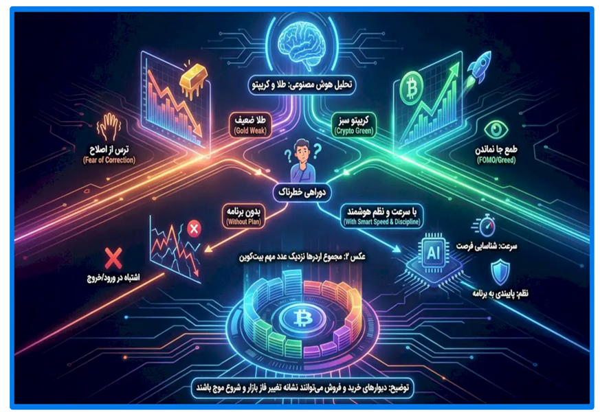 در این سناریو اگر طلا شروع به ریزش کند، خیلی ها وسوسه میشوند پول را از طلا خارج کنند و ببرند سمت بازارهایی که هیجان و بازدهی بیشتری دارد. دقیقا همین جاست که کریپتو در ذهن مردم روشن میشود. چون کریپتو بازاری است که وقتی طمع فعال میشود، خیلی سریع واکنش نشان میدهد. پس اگر احساس ثبات موقت شکل بگیرد، احتمال این هست که طلا فشار فروش بگیرد و کریپتو با ورود پول تازه جان بگیرد. این فرصت میتواند حتی در دو هفته آینده واضح تر شود، چون بازارها منتظر قطعی شدن خبر نمیمانند و با احتمال ها قیمت گذاری میکنند.
