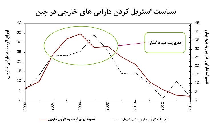 علاوهبر این، باید اشاره کرد که با کاهش نرخ بهرهروی اوراق قرضه آمریکا، هزینه انتشار اوراق قرضه مرکزی چین بالا رفت. با این روند سیاستگذاران این کشور سعی کردند که تغییرات اوراق قرضه را براساس تغییرات دارایی خارجی تنظیم کنند و پس از طی کردن یک دوره گذار، سهم تغییرات دارایی خارجی به پایه پولی کاهش یافته است.