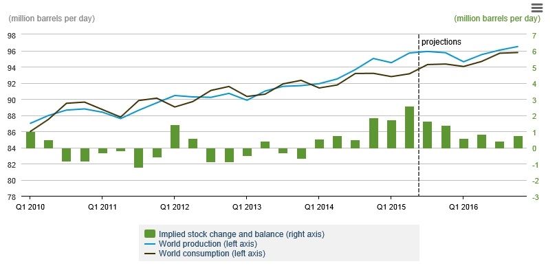 از سوی دیگر با در نظر گرفتن میزان عرضه و تقاضای نفت در سطح جهانی متوجه میشویم بازار نفت از اوایل سال 2014 دچار اضافه عرضه بوده است و این میزان در سهماهه اول سال 2015 به اوج خود رسیده است و تا کنون نیز ادامه دارد، نکته مهم در این روند این است که شرایط اساسی بازار تغییری نکرده است. تصویر زیر شرایط تعادل عرضه و تقاضای بازار نفت را نشان می دهد.