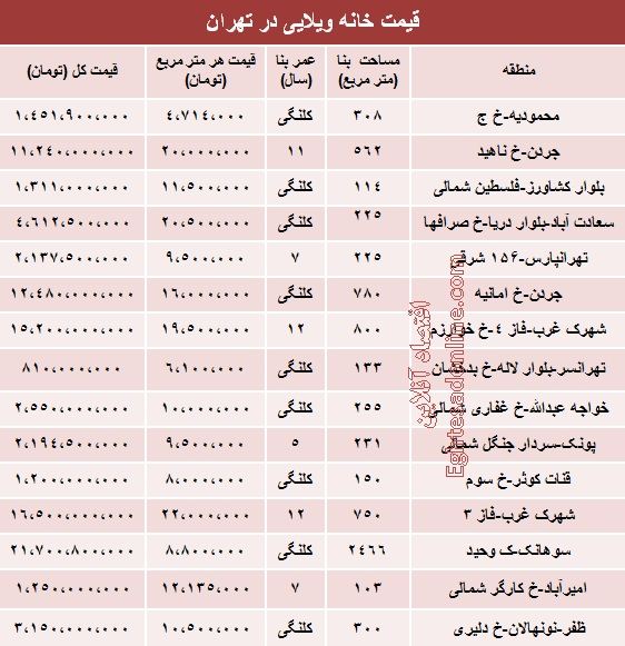 قیمت خانه های ویلایی در مناطق 22 گانه شهر تهران که معامله شده اند.
