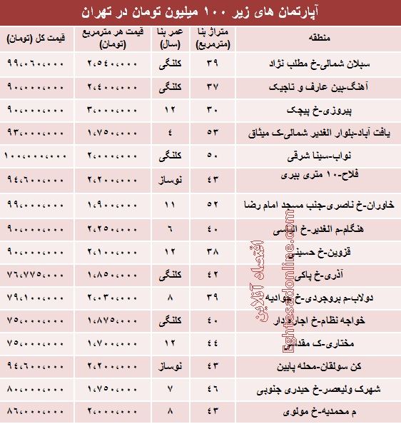 براساس این گزارش، آنچه در زیر می آید جدول قیمت معاملات انجام شده آپارتمان در مناطق مختلف شهری تهران است که می توان با 100 میلیون تومان خرید.