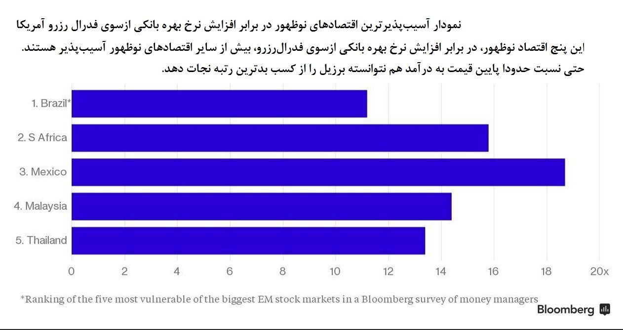 بر اساس نظرسنجی جدید بلومبرگ، پس از افزایش نرخ بهره ازسوی فدرال‌رزرو آمریکا، از میان 10 اقتصاد نوظهور جهان، هند احتمالا بهترین و برزیل، بدترین وضعیت را خواهد داشت.
