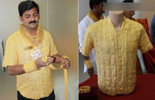 این مرد 32 ساله با پرداخت این مبلغ و صرف 16 ساعت روزانه طی دو هفته توانست پیراهنی از جنس طلا بسازد، او این لباس را با مچ بند و گردنبند و ساعت طلا ست کرده است.