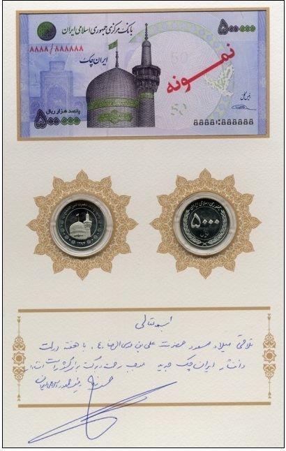 در روز ولادت با سعادت امام رضا علیه السلام ریاست محترم جمهوری در مراسمی از ایران چک 500 هزار ریالی و ضرب سکه های 5 هزار ریالی، مدال های یادبود طلا و نقره رونمایی کردند.