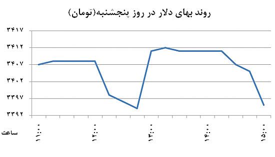 چهارشنبه، دلار کمی از نزدیکی سطح 3400 تومان فاصله گرفت و به قیمت 3395 تومان رسید. نهایتا روز پنج‌شنبه دلار نوسانی را نسبت به روز قبل تجربه نکرد و روی همان قیمت 3395 تومان به کار خود پایان داد. با وجود آرامش قیمتی دلار در روز پنج‌شنبه، تعدادی از فعالان اعتقاد دارند که امروز شنبه این ارز از مرز 3400 تومان عبور خواهد کرد. به گفته آنها، فشار تقاضا در حدی بالاست که قیمت در همان هفته گذشته هم ظرفیت عبور از مرز روانی را داشت، اما بازارساز ارزی با عرضه خود مانع عبور دلار شد.