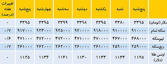 پنج‌شنبه گذشته، دلار مانند روز چهارشنبه روی قیمت 3395 تومان قرار گرفت و نوسانی را تجربه نکرد. ماندن روی قیمت 3395 تومان موجب شد که شاخص بازار ارز نسبت به نرخ بسته شده انتهای هفته پیش از آن نیز نوسانی را تجربه نکرده باشد. فعالان، کاهش حجم معاملات و عرضه بازارساز را از عوامل سکون دلار در روز پنج‌شنبه دانستند؛ اما برخلاف روند کم نوسان دلار، پنج‌شنبه، سکه تمام بهار آزادی، بیشترین کاهش روزانه خود در هفته را تجربه کرد و با 6 هزار تومان نزول از کانال 920 هزار تومان خارج شد و به قیمت 917هزار تومان رسید. البته با وجود این افت، این فلز گرانبها رشدی 7/ 0 درصدی را در طول هفته برای خود رقم زد.