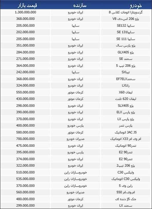 قیمت برخی خودروهای داخلی بر اساس استعلام از بنگاه های تهران: