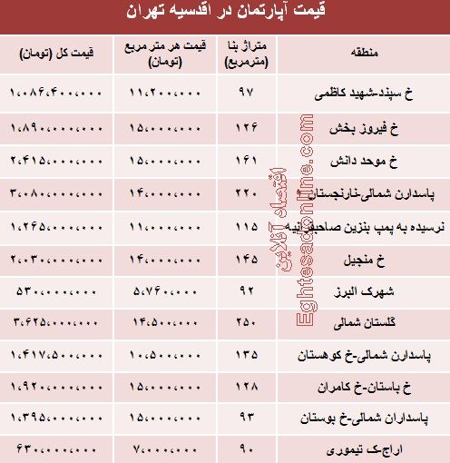 آنچه در زیر می آید جدول معاملات انجام شده آپارتمان نوساز در محله اقدسیه تهران است.