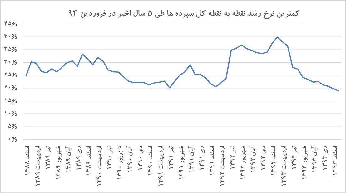 آخرین آمار بانک مرکزی نشان میدهد که میزان مانده سپرده بانکی در فروردین سال 94 به 833 هزار و 270 میلیارد تومان رسیده است. در نتیجه، رشد ماهانه مانده سپرده در فروردین سال جاری به 7/ 1 درصد رسیده است. رشد ماهانه مانده سپردهها در فروردین سال گذشته معادل 4/ 2 درصد گزارش شده است. بنابراین خیز سپردهگیری در ابتدای سال جاری نسبت به مدت مشابه سال قبل، کمرمقتر بوده است. علاوه بر این رشد سپردهها در فروردین سال جاری نسبت به مدت مشابه سال قبل (رشد نقطه به نقطه) معادل 9/ 18 درصد گزارش شده است، که این مقدار در فروردین سال 93 معادل 9/ 39 درصد ثبت شده بود و نشان میدهد طی ماههای گذشته رشد نقطه به نقطه سپردهگیری، کاهش قابل توجهی داشته است. بررسیها نشان میدهد رشد نقطه به نقطه در فروردین 94 طی 5 سال اخیر کمترین مقدار بوده است.