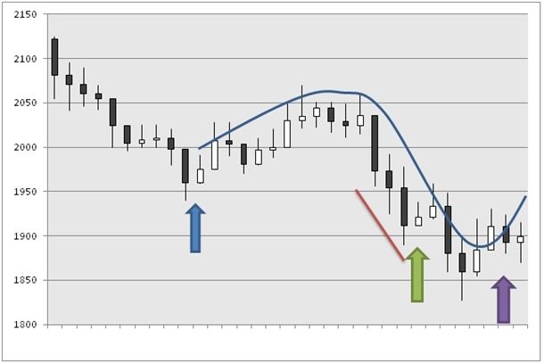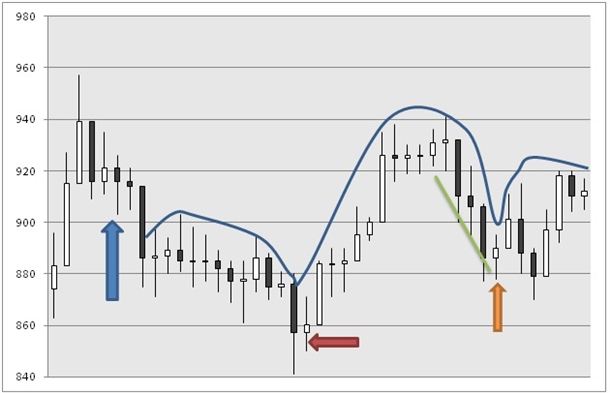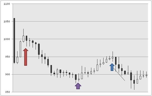 در پی این نزول بار دیگر با شکل گیر یک کندل چکشی دیگر این روند تغییر شکل داده و به حال مثبت درآمد(فلش قرمز رنگ). شکل گیری سه اهرم منفی که دو مودرد آن بسیار قوی است نوید دهنده روند نزول بود که خوشبختانه با یک کندل چکشی این روند بار دیگر تغییر مسیر داده است. اما مورد مهم در این نمودار شکل گیری یک الگو سر و شانه میباشد که نزول این سهم در کوتاه مدت محتمل است. ولی پس از شکل گیری این الگو احتمال بازگشت قوی قیمت آن وجود دارد.