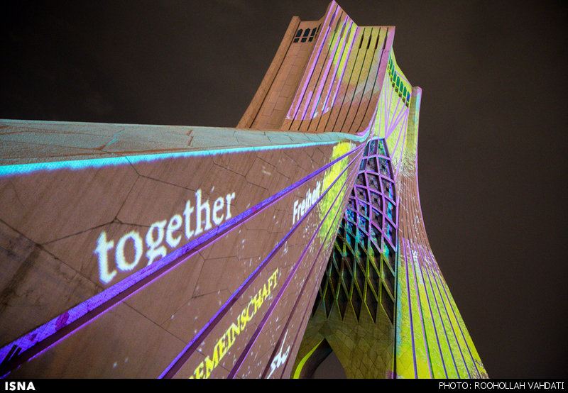«فلیپ گایست» که به دعوت سفیر آلمان در ایران برای اولینبار به تهران سفر کرده، برج آزادی را به دلیل معماریاش برای نورپردازی انتخاب و به مناسبت روز اتحاد آلمان شرقی و غربی با کلماتی مانند صلح، عشق، آزادی و طرحی از کاشیهای آبی فیروزهای روشن کرد.