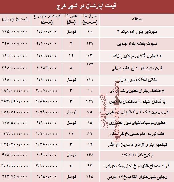 آنچه که مشاهده می کنید جدول قیمت معاملات انجام شده آپارتمان در شهر کرج در مهر ماه 94می باشد.