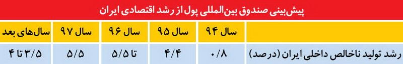 صندوق بینالمللی پول برآورد میکند درپی لغو تحریمها فعالیتهای اقتصادی داخلی بهطور چشمگیری افزایش خواهد یافت. این صندوق پیشبینی میکند اقتصاد ایران در سال2015 رشد 8/ 0 درصدی و در سال 2016 رشد 4/ 4درصدی را ثبت خواهد کرد. اما رشد اقتصادی ایران در دوره 2017-2016 (سال 96 شمسی) و 2018-2017 (سال 97 شمسی) تا 5/ 5 درصد افزایش خواهد یافت و در سالهای بعد از آن سالانه حدود 5/ 3 تا 4درصد رشد خواهد کرد. مهمترین عامل این رشد در کوتاهمدت بهبود تولید و صادرات نفت خواهد بود که پیشبینی میشود در سال 2016 تا حدود 600 هزار بشکه در روز افزایش خواهد یافت و در میانمدت حدود 2/ 1 میلیون بشکه در روز رشد خواهد کرد. افزایش تولید نفت حدود سه چهارم رشد اقتصادی ایران در دوره 2017-2016 و حدود دو سوم رشد اقتصادی در دوره 2018-2017 را شکل خواهد داد. کاهش هزینههای تجارت و مبادلات مالی حدود سهچهارم تا یک درصد به رشد اقتصادی ایران اضافه خواهد کرد. پس از لغو تحریمها کارآیی اقتصاد غیرنفتی به تدریج بهبود خواهد یافت، زیرا کاهش هزینه معاملات موجب ترغیب سرمایهگذاری و بهرهوری به ویژه در تولید و ساخت و ساز خواهد شد.