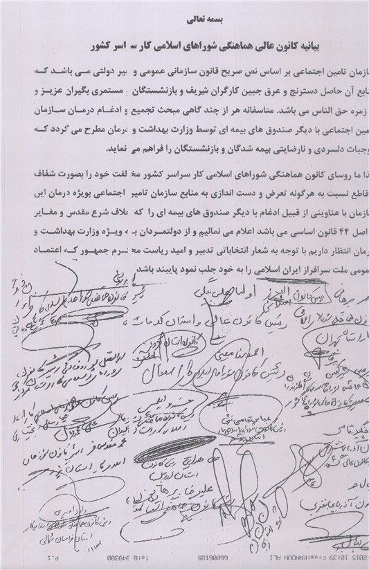 لذا ما روسای کانون هماهنگی شوراهای اسلامی کار سراسر کشور مخالفت خود را بهصورت شفاف و قاطع نسبت به هرگونه تعرض و دستاندازی به منابع سازمان تأمین اجتماعی بهویژه درمان این سازمان با عناوینی از قبیل ادغام با دیگر صندوقهای بیمهای را که خلاف شرع مقدس و مغایر با اصل 44 قانون اساسی میباشد اعلام مینمائیم و از دولتمردان بهویژه وزرت بهداشت و درمان انتظار داریم با توجه به شعار انتخاباتی تدبیر و امید ریاست محترم جمهور که اعتماد عمومی ملت سرافراز ایران اسلامی را به خود جلب نمود پایبند باشد.