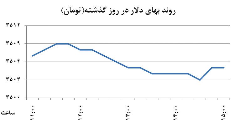 پس از نوسان 20 تومانی روز یکشنبه و عبور دلار از کانال 3400 تومان، فضای بازار ارز آرام شد و نوسانات آن به دامنهای 5 تومانی محدود شد. دلار که روز یکشنبه با 20 تومان رشد به قیمت 3510 تومان رسیده بود، روزهای دوشنبه، سهشنبه و چهارشنبه در بازه 3505 تومان تا 3510 تومان نوسان کرد تا بتوان از انقباض نوسان در این 3 روز سخن گفت. روند روزانه پنجمین روز هفته جاری نیز شاهد کاهش تغییرات دلار بود. چهارشنبه، شاخص بازار ارز معاملات خود را با قیمت 3507 تومان آغاز کرد که افزایشی 2 تومانی نسبت به قیمت بسته شده روز سهشنبه داشت. در ادامه روز، قیمت تا نزدیک 3510 تومان نیز بالا رفت، ولی نهایتا با پایین آمدن از سقف روزانه روی همان قیمت 3505 تومان روزهای دوشنبه و سهشنبه آرام گرفت.