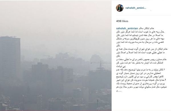 به گزارش خبرنگار گروه فضای مجازی خبرگزاری فارس، راحله امینیان مجری تلویزیون در آخرین مطلب خود در اینستاگرام به وضعیت آلوده هوای پایتخت اعتراض کرد.