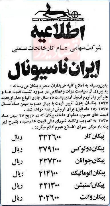 آگهی فروش پیکان به قیمت 33 هزار تومان اقتصادنیوز آگهی فروش پیکان به قیمت ۳۳ هزارتومان را منتشر کرد. تاریخ: ۹/ارديبهشت/۹۵ ساعت ۱۶:۴۰ | سرگرمی شناسه خبر: ۳۳۶۸۵ خبر را برای من بخوان این تصویر مربوط به اواسط دهه 50 شمسی است که توسط کانال هیستوگرافی در تلگرام بازنشر شده است. برچسب ها : آگهی فروش پیکان