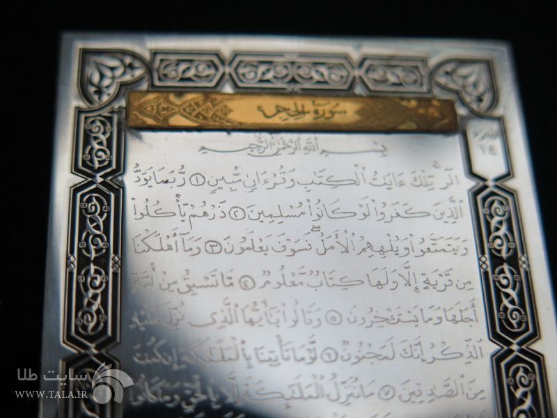 در تهیه این قرآن نفیس بیش از 60 کیلو گرم نقره و یک کیلو گرم طلای 24 عیار استفاده شده و 610 قطعه نقره و بیش از 2000هزار قطعه طلا روی آن کار شده است.