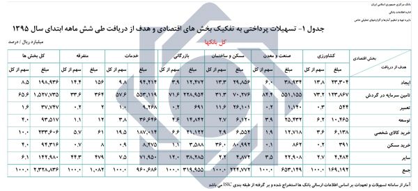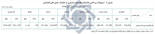تسهیلات پرداختی بانک‌ها طی شش ماهه سال 1395 به بخش‌های اقتصادی مبلغ 2328.8 هزار میلیارد ریال است که در مقایسه با دوره مشابه سال قبل مبلغ 727.3 هزار میلیارد ریال (معادل 45.4 درصد) افزایش داشته است.