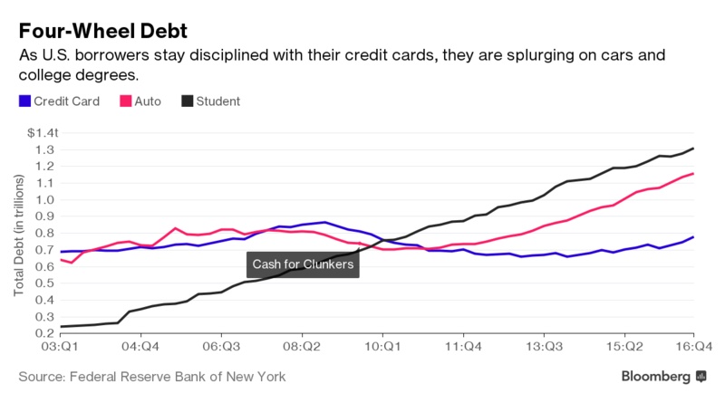 آمریکایی ها عاشق خودروهایشان هستند. به طوری که بدهی های آمریکایی ها برای خرید خودرو به خصوص خودروهای بزرگی که گالن گالن بنزین استفاده می کنند،همیشه رقم بزرگی است. آمار کلی وام خودرویی آمریکایی ها در چهارماهه آخر سال 2016 به رکورد رسیده است و این موضوع نشان دهنده یک بازار حبابی است. راننده هایی با اعتبارهای پایین وام هایی بیش از دارایی خود می گیرند.
