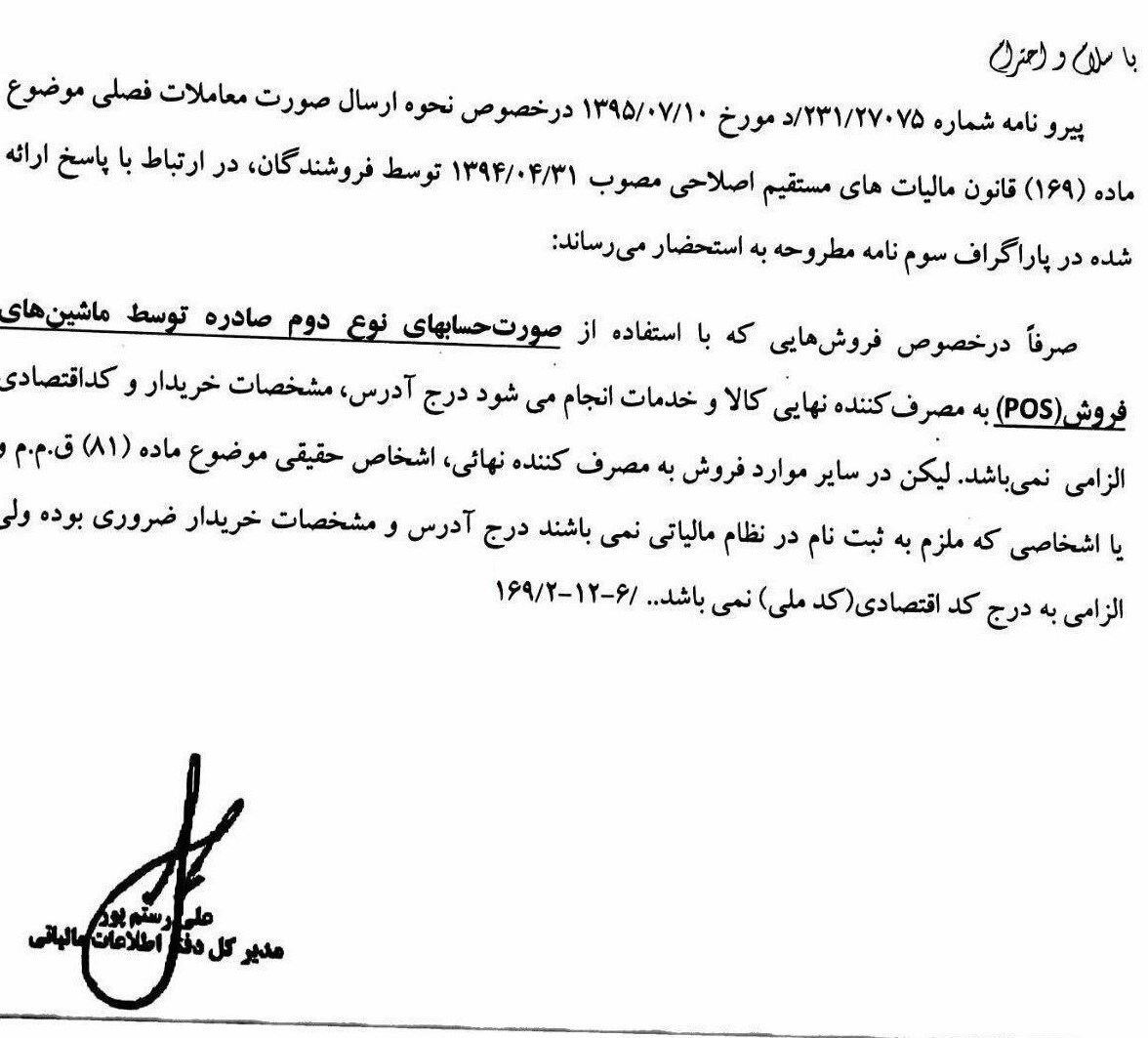 در بخشنامه مدیر کل دفتر اطلاعات مالیاتی آمده است، در خصوص نحوه ارسال صورت معاملات فصلی ماده 169 قانون مالیاتهای مستقیم اصلاحی مصوب سال 94 توسط فروشندگان، صرفا در مورد فروشهایی که با استفاده از صورتحسابهای نوع دوم صادره توسط ماشینهای فروش(pos) به مصرف کننده نهایی کالا و خدمات انجام میشود، درج آدرس، مشخصات خریدار و کد اقتصادی اجباری نمیباشد.