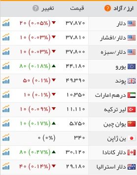 این در حالی است که بازار ارز مخالف بازار سکه با روندی کاهشی رو به رو شد. دلار آمریکا با کاهش ۲ تومان نسبت به روز گذشته با قیمت ۳ هزار و ۷۸۷ تومان در بازار عرضه شد. یورو اروپا ۴ هزار و ۴۱۸ تومان، پوند انگلیس ۴ هزار و ۹۳۹ تومان و لیر ترکیه هزار و ۱۱۱ تومان است.