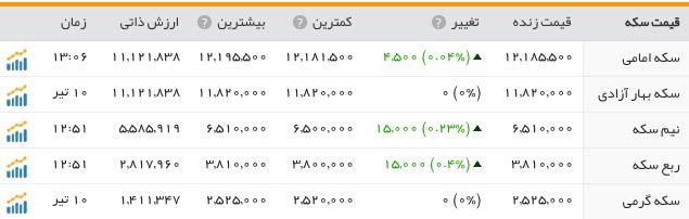 به گزارش سایت طلا به نقل از خبرگزاری خبرآنلاین، بازار سکه در دومین روز هفته با روندی صعودی رو به رو شد. سکه امامی با افزایش ۴۵۰ تومان نسبت به روز گذشته با قیمت یک میلیون و ۲۱۸ هزار و ۵۵۰ تومان در بازار به فروش رسید. نیم سکه و ربع سکه نیز هر دو با افزایش هزار و ۵۰۰ تومان نسبت به روز گذشته به قمیت های ۶۵۱ هزار و ۳۸۱ هزار تومان رسیدند.
