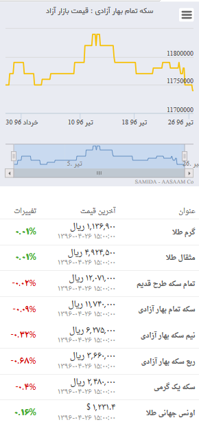 به گزارش سایت طلا به نقل از خبرگزاری اقتصادانلاین آنچه در ذیل می آید جدول قیمت روز جاری طلا و سکه و مقایسه با آخرین قیمت های ثبت شده روز گذشته است. جدول زیر به همراه نمودار تغییرات یک ماه، چند ماه و چند سال گذشته قیمتها میتواند نوسانات دقیق بازار را به شما نشان دهد؛