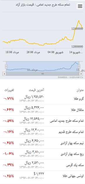 آنچه در ذیل می آید جدول قیمت روز جاری طلا و سکه و مقایسه با آخرین قیمت های ثبت شده روز گذشته است. جدول زیر به همراه نمودار تغییرات یک ماه، چند ماه و چند سال گذشته قیمت‌ها می‌تواند نوسانات دقیق بازار را به شما نشان دهد؛