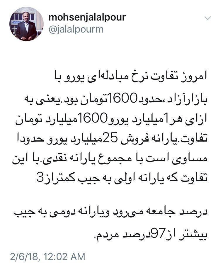 وی افزود: امروز تفاوت نرخ مبادله ای یورو با بازار آزاد، حدود 1600 تومان بود. یعنی به ازای هر یک میلیارد یورو 1600 میلیارد تومان تفاوت. یارانه فروش 25 میلیارد یورو حدودا مساوی است با مجموع یارانه نقدی. با این تفاوت که یارانه اولی به جیب 3 درصد جامعه می رود و یارانه دومی به جیب بیش از 97 درصد مردم.