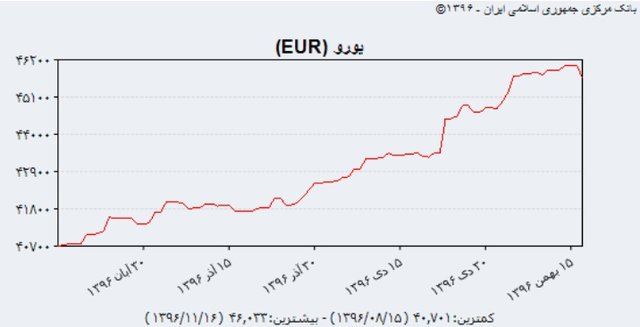 در بازار رسمی نیز قیمت یورو در حدود سه ماه اخیر تا ۷۵۰ تومان و در یک ماه گذشته تا ۳۰۰ تومان افزایش قیمت داشته است. یورو اکنون در مرکز مبادلات ارزی تا ۴۵۶۸ تومان نرخگذاری میشود. در این حالت اختلاف قیمت نرخ رسمی و آزاد یورو بیش از ۱۵۰۰ تومان است.