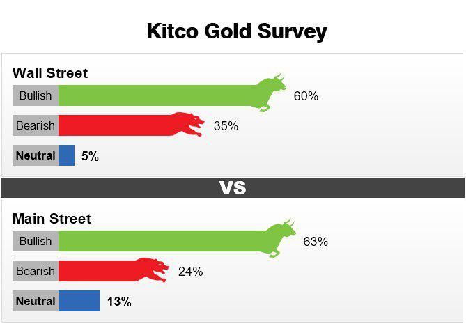کارشناسان اقتصادی وال استریت در دو هفته گذشته به کاهش قیمت طلا رای داده بودند. در نظرسنجی آنلاین مین استریت نیز 450 نفر شرکت کردند که 284 نفر معادل 63 درصد به افزایش قیمت طلا رای دادند. 106 نفر معادل 24 درصد نیز پیش بینی کردند قیمت طلا کاهش خواهد یافت و 60 نفر معادل 13 درصد نیز اعلام کردند قیمت طلا تغییری نمی کند.