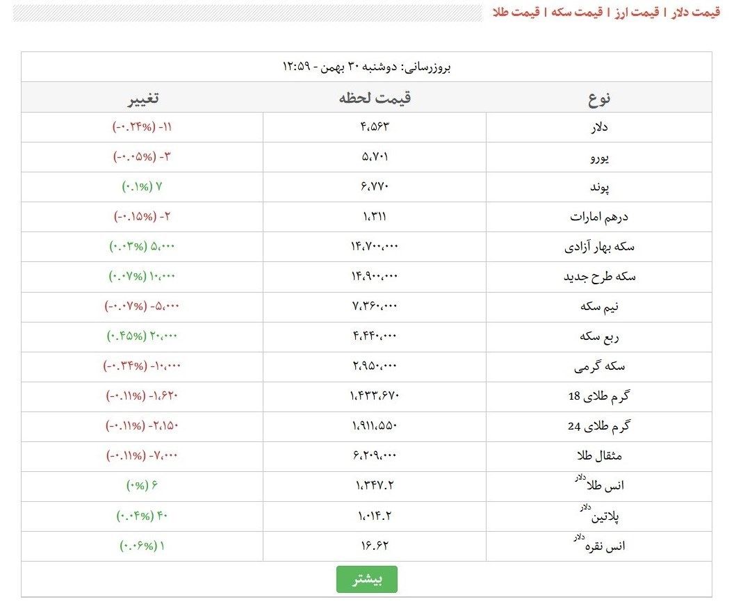 قیمت طلا، قیمت دلار، قیمت سکه و قیمت ارز امروز ۹۶/۱۱/۳۰