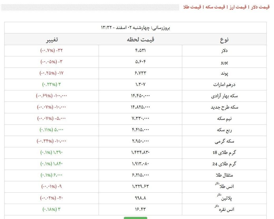 قیمت طلا، قیمت دلار، قیمت سکه و قیمت ارز امروز ۹۶/۱۲/۲