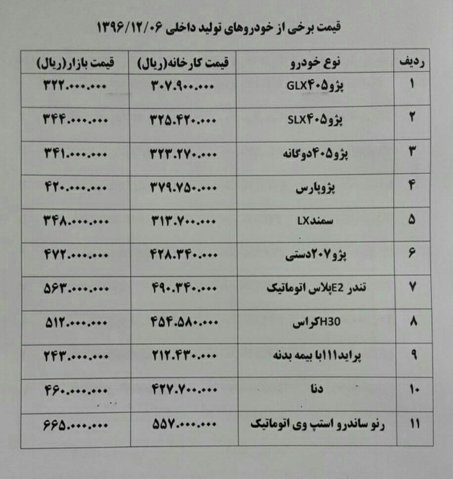 قیمت تعدادی از خودروهای داخلی به شرح زیر است: